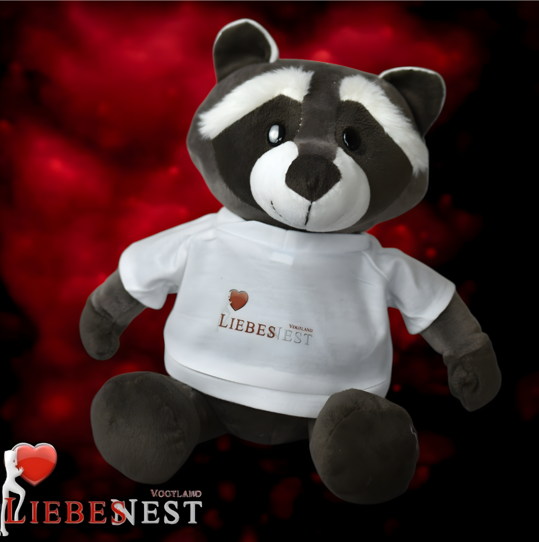 Plüschtier-Waschbär mit LiebesNest-Logo